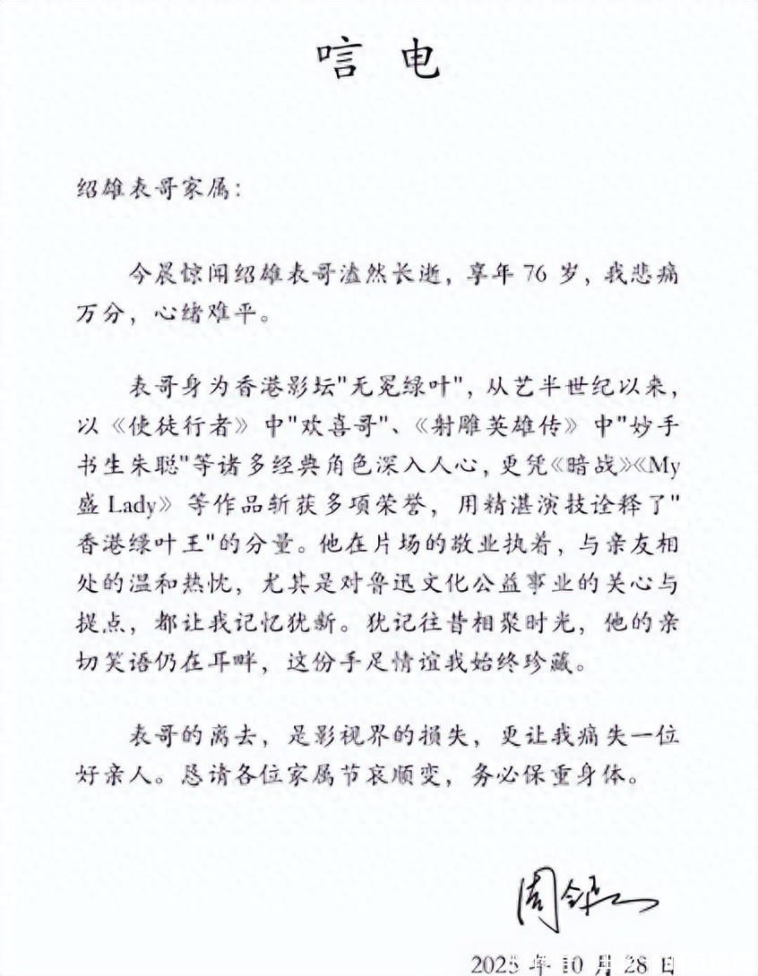 在得知表哥去世的消息之后,周令飞也是第一时间发文悼念。