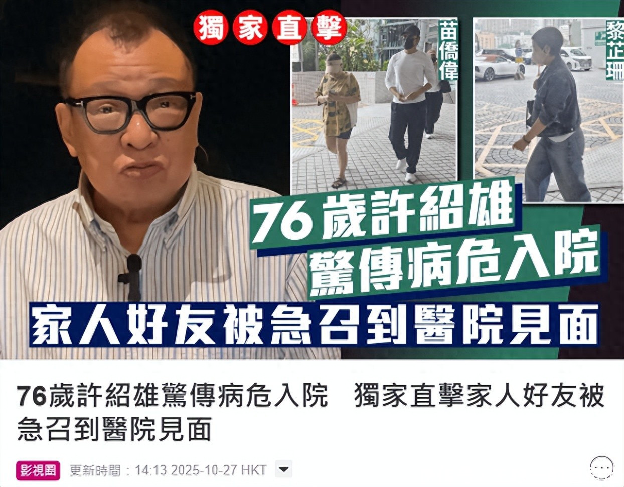 10月27日,港媒突然曝出许绍雄病危住院。消息一出,立马就登上了热搜,引发网友的关注和热议。