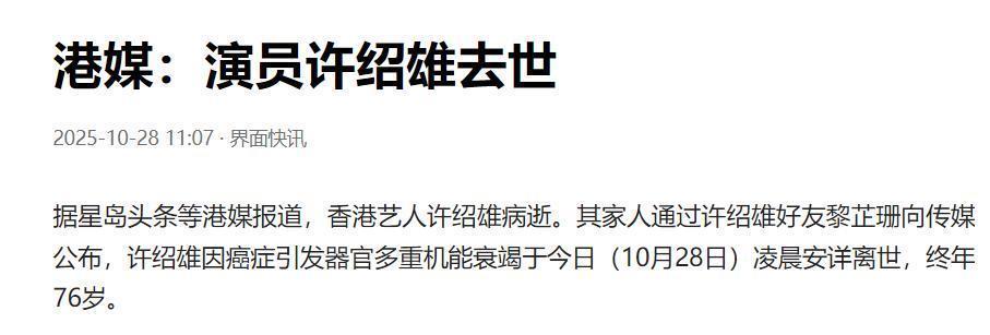 香港著名演员许绍雄去世了,享年76岁。